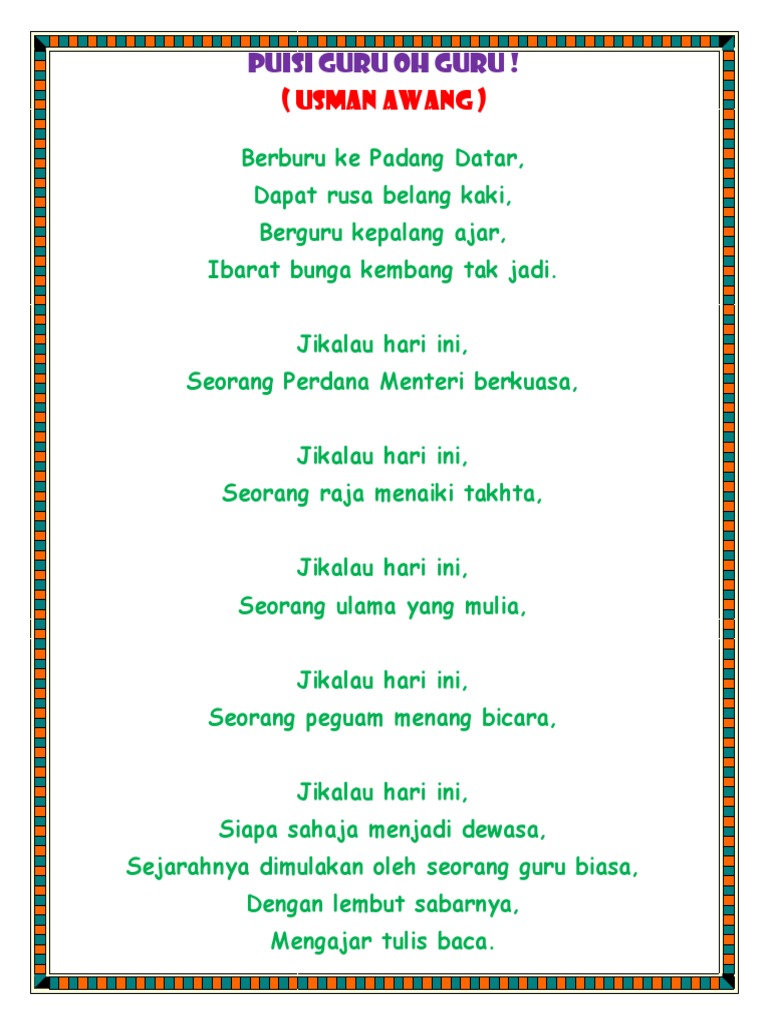 Makna Puisi Usman Awang International Journal Of The Malay World And Civilisation Iman 4 3 2016 57 64 Http Dx Doi Org 10 17576 Iman 2016 0403 06 Course Hero from www.coursehero.com Desta ngantuk, enzy kena galaknya. Kali ini decyra akan membahas mengenai macam macam bunga hias. Namun pada umumnya, batangnya berduri. Usman awang adalah nama tersohor bagai bintang yang gemerlapan sepanjang zaman. Tapi siang akan memanjat jua dan malam bakal rebah di kaki subuh: Selain cantik, setiap bunga juga memiliki karakternya sendiri. Rosa berarti mawar, dan sinensis mempunyai arti dari daerah china. Dalam tahun 1991, beliau telah di anugerahi darjah kebesaran dato' paduka oleh sultan perak darul ridzuan yang membawa gelaran dato'.